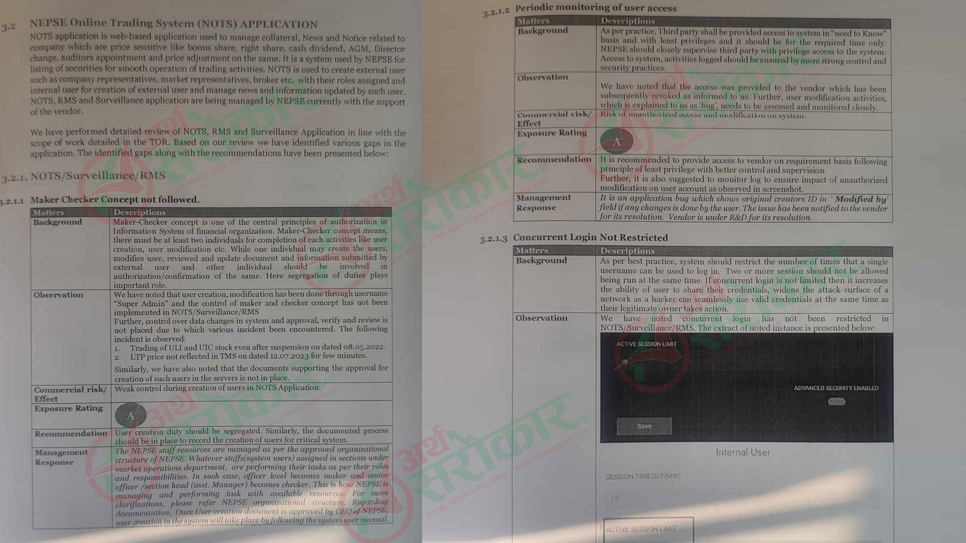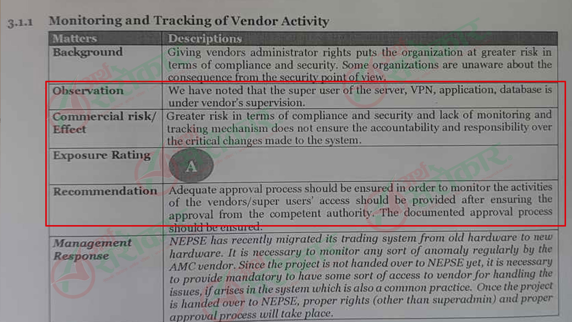 काठमाडौँ । नेप्सेले कारोबार प्रणाली लगायतका सम्पूर्ण आईटी जोडिएका सिष्टमहरुको परिक्षणका लागि गरेको ‘इन्फर्मेसन सिष्टम अडिट (आईएस अडिट)’ ले नेप्सेको कारोबार प्रणाली असुरक्षित रहेको खुलासा गरेको छ । नेप्सेले गराएको आईएस अडिटका क्रममा केहि सार्है संवेदनशील विषयको उठान भएको पाइएको छ भने अन्य थुप्रै जोखिमहरु पनि नेप्सेको कारोबार प्रणालीमा रहेको खुलासा भएको छ । आफ्नो कमजोरी बाहिर आउने डरले नेप्सेले प्रतिवेदनले उठाएका विषयहरुको सम्बोधन गर्नुको सट्टा आइएस अडिटको यो प्रतिवेदन लुकाएर राख्ने गरेको छ ।