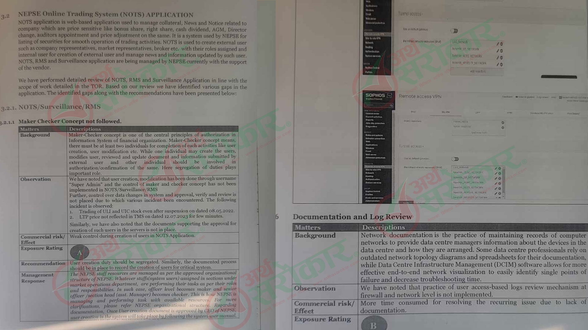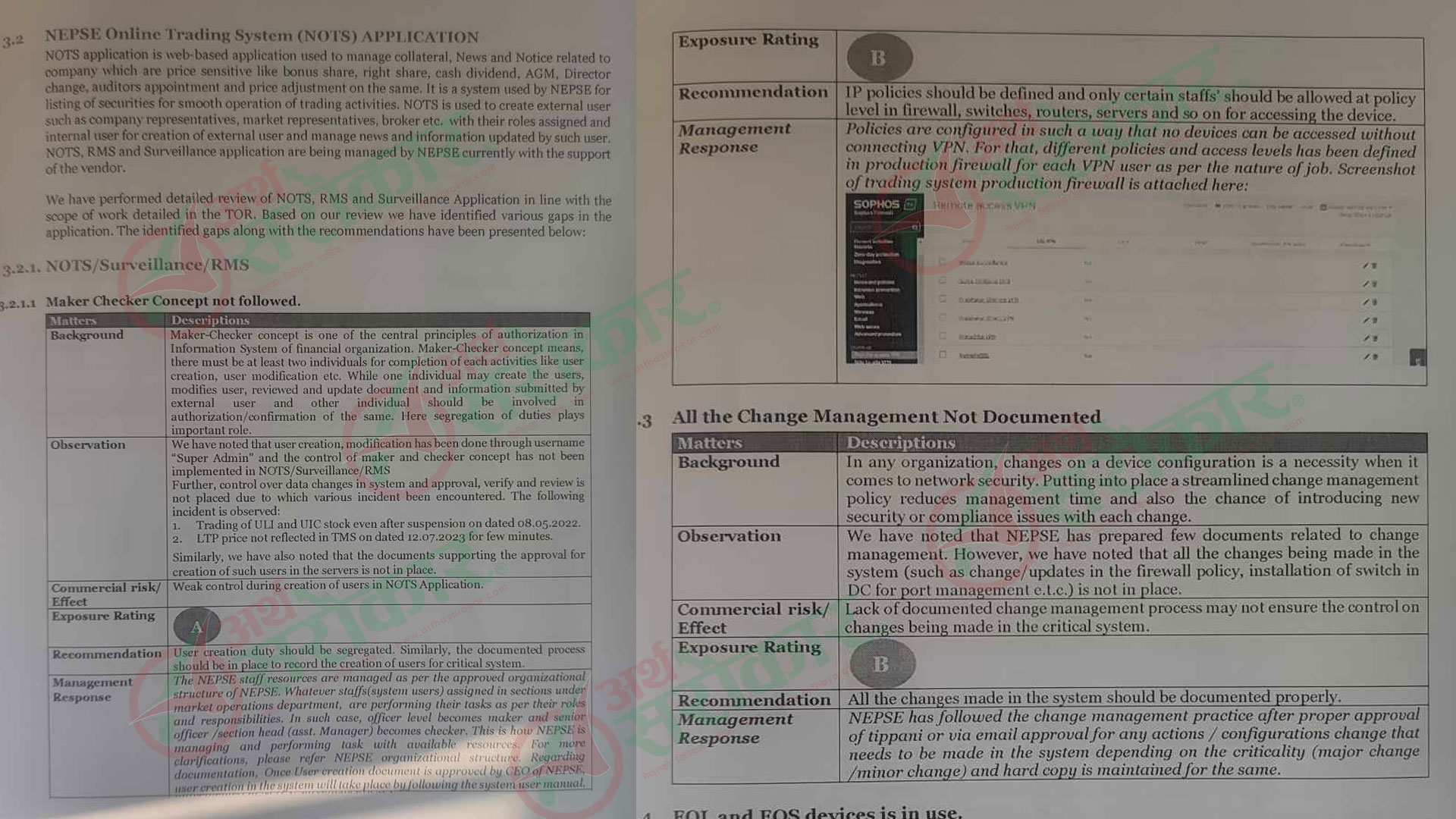 सो प्रतिवेदनले भीपीएन प्रयोगबाट पनि भेण्डरले सिष्टममाथि पूर्ण पहुँच राख्ने गरेको र सो को विवरण वा एक्सन लग नेप्सेसँग नरहने भएकाले वाईकोको सेटिङमा कुनै पनि खालको अनाधिकृत पहुँच नेप्सेको सिष्टममा हुन सक्ने, प्रणालीमा रहेका सबै डाटा लिक हुन सक्ने, कम्पनीका संवेदनशील तथ्यांक र कारोबार प्रणालीमा भएका विवरणहरुसमेत चुहावट हुन सक्ने उल्लेख छ । सो प्रतिवेदनले नेप्सेको नट्स प्रणालीमा पनि संवेदनशील कैफियतहरु भएको तथ्य उजागर गरेको छ ।